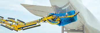 The NORDIC DINO robots, a computerized and self-contained system purpose built for washing aircraft exteriors. The system consists of a mobile power unit, spray nozzles and rotating cleaning brushes powered by a lightweight remote control that permits safe and simple one-man operation.